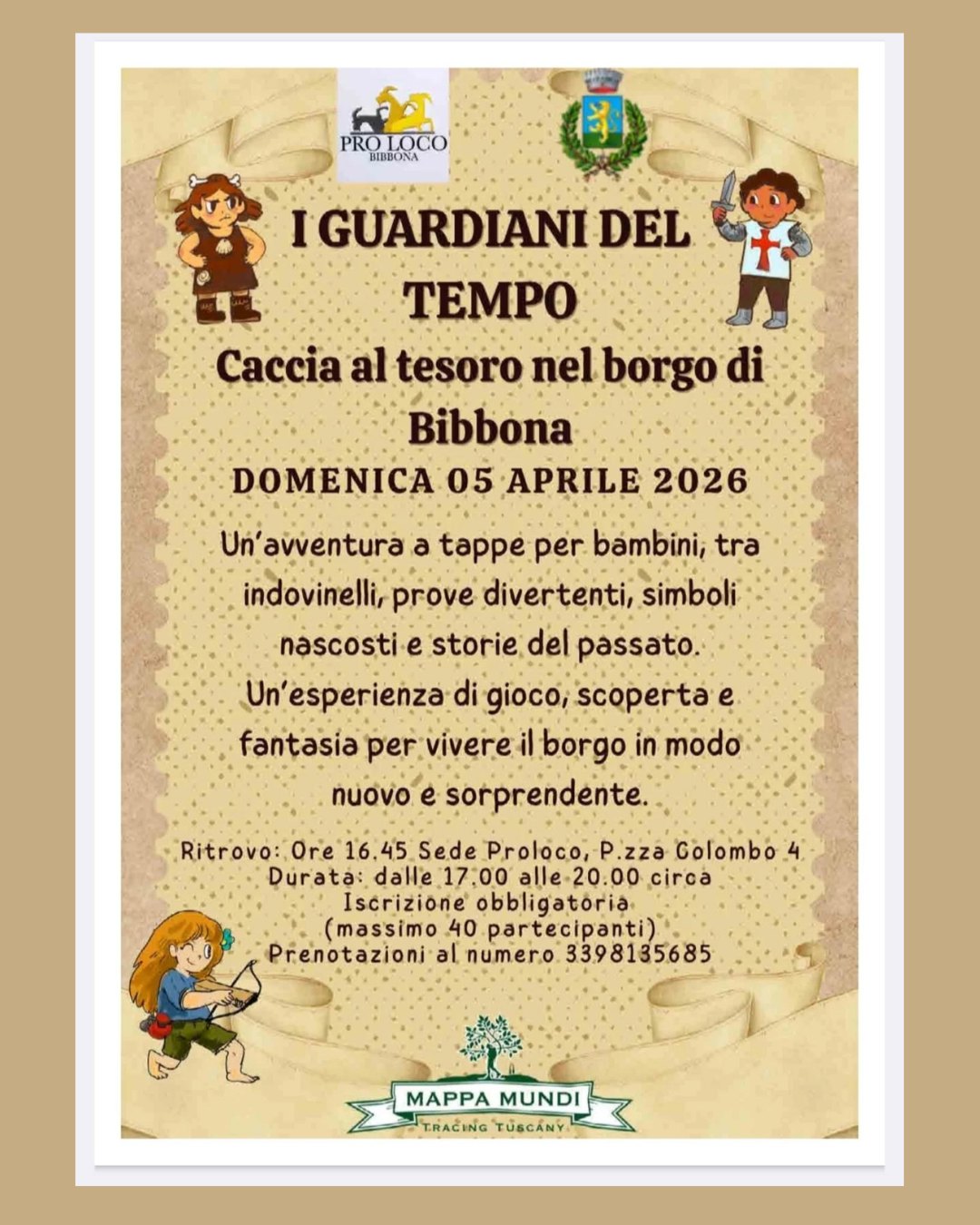 Domenica 5 Aprile ore 17.00 - I Guardiani del tempo: Caccia al tesoro nel borgo di Bibbona. Un'avventura a tappe per bambini, tra indovinelli, prove divertenti, simboli nascosti e storie del passato. Un'esperienza di gioco, scoperta e fantasia per vivere il borgo in modo nuovo e sorprendente.